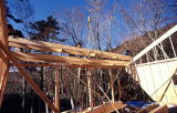 | H木箱の完成 屋根下地のコンパネを張る。 屋根面が完成する。箱の形ができあがり、 構造も安定する。 屋根と外壁のコンパネの上に硬質ウレタンフォームとガルバリウム鋼鈑との複合板であるフォームナートパネル丸波を張る。 板金工事と断熱工事が一度に行える。これで外回りが完成である。 |