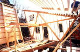 F小屋組 現場の敷地は広いが平坦な場所がない為、地上で屋根面をパネル化することができない。2本のLVLの垂木と転び止めでつくったユニットをクレーンで上げて、垂木を組んでいく。 |